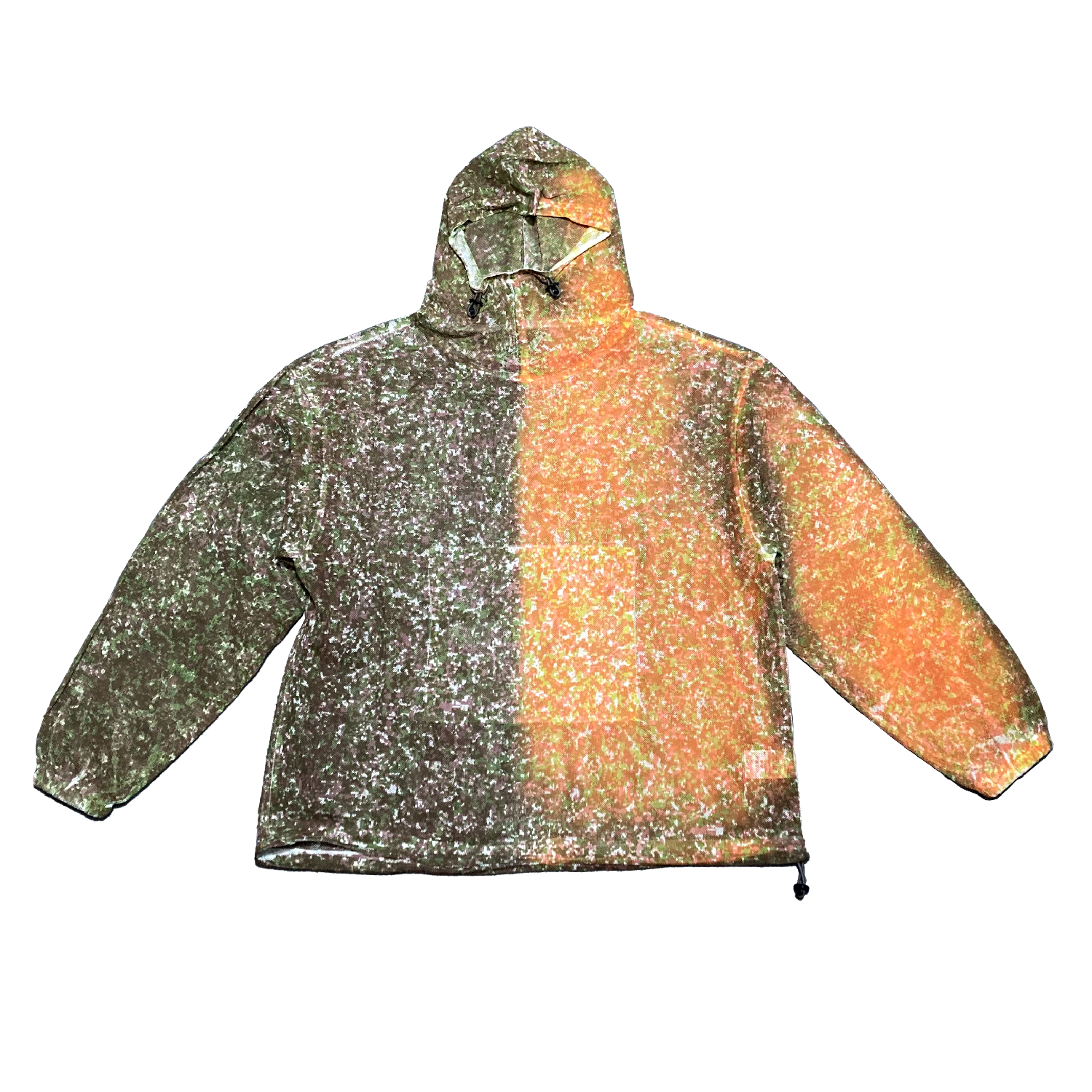 It’s printed on 100% polyester mesh using two colors of heat-reactive ink.